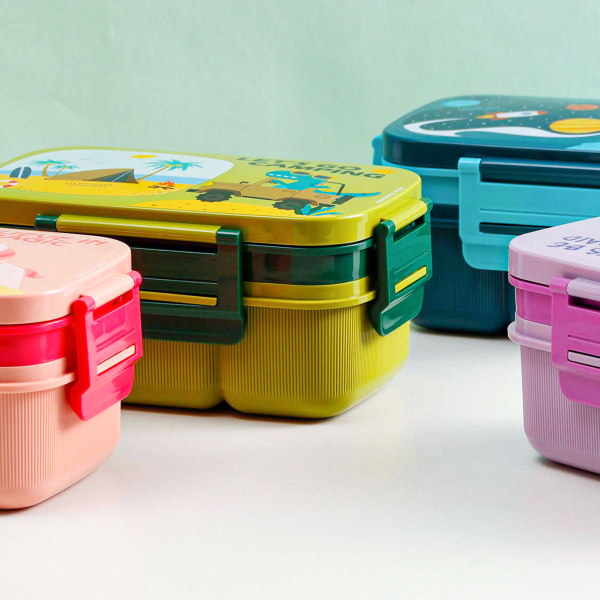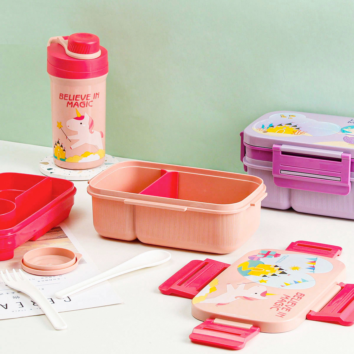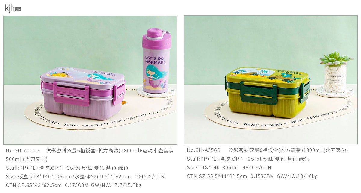 紋彩密封雙層6格飯盒(長方高款)1800ml+運(yùn)動(dòng)水壺套裝500ml (含刀叉勺)