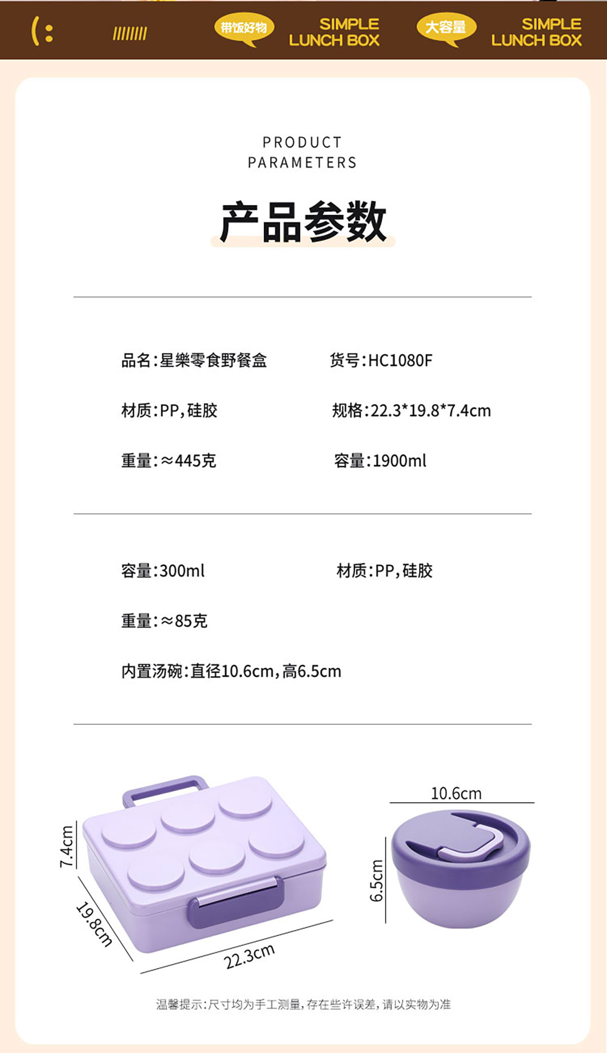 Size: 飯盒:223*198*77mm/1900ml 湯碗:直徑106*高65mm/300ml